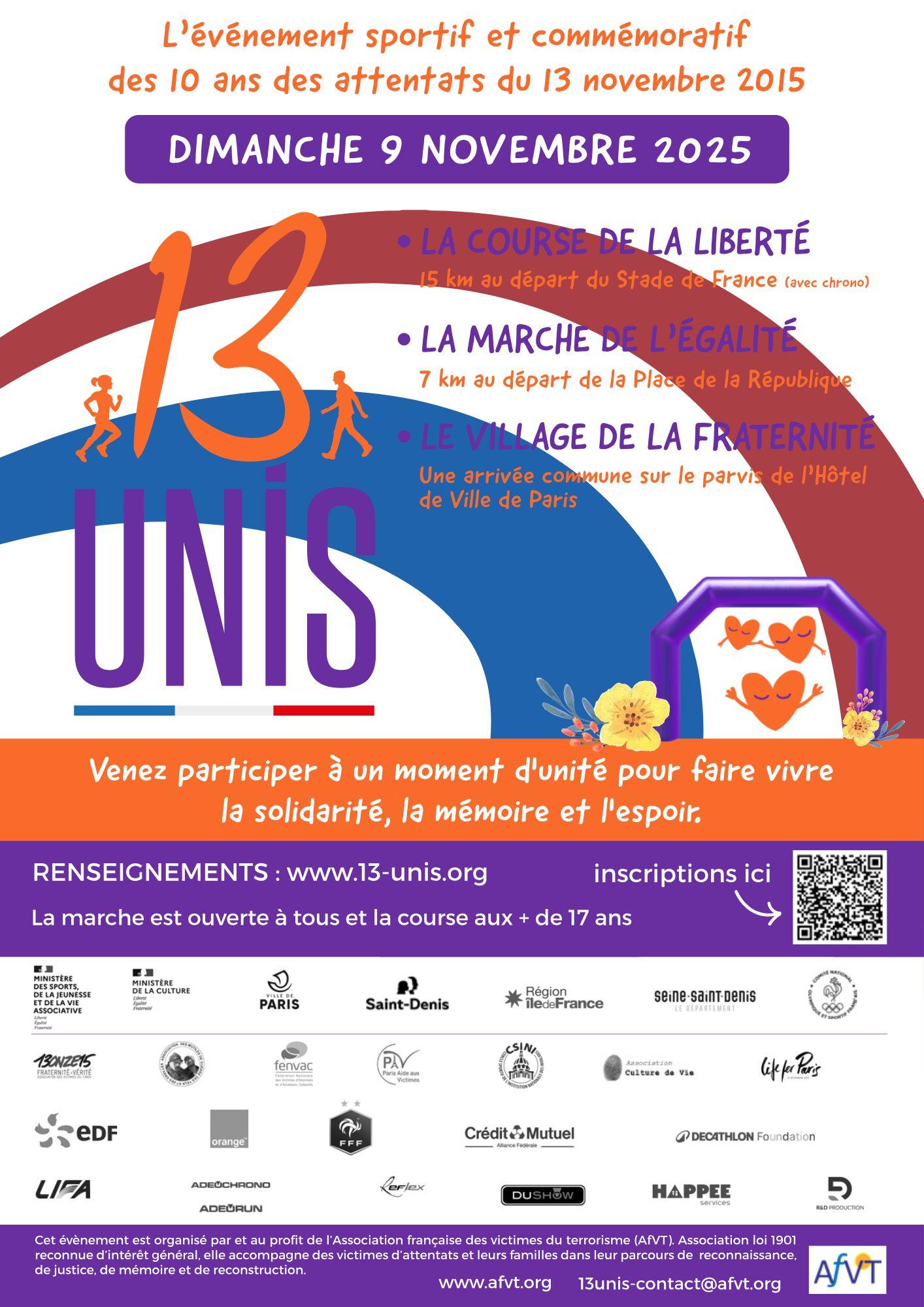 Dans le cadre des commémorations des 10 ans des attentats du 13 novembre 2015, l'Association Française des Victimes du Terrorisme (AFVT) organise un évènement sportif et citoyen le dimanche 9 novembre.