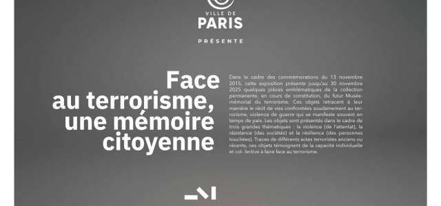 Cette exposition s’inscrit dans une séquence nationale de mémoire et de mobilisation. Elle accompagne le développement du Musée-mémorial du terrorisme en présentant pour la première fois au grand public une partie de ses futures collections permanentes. Elle présente des dons de victimes, de proches de victimes et d’institutions impliquées dans la lutte contre le terrorisme, ainsi qu’un scellé judiciaire d’une affaire définitivement jugée. Loin de se limiter à l’entretien du souvenir, mémoire individuelle et mémoire collective se rejoignent dans un engagement citoyen, qui témoigne de la résistance et de la résilience de nos sociétés.