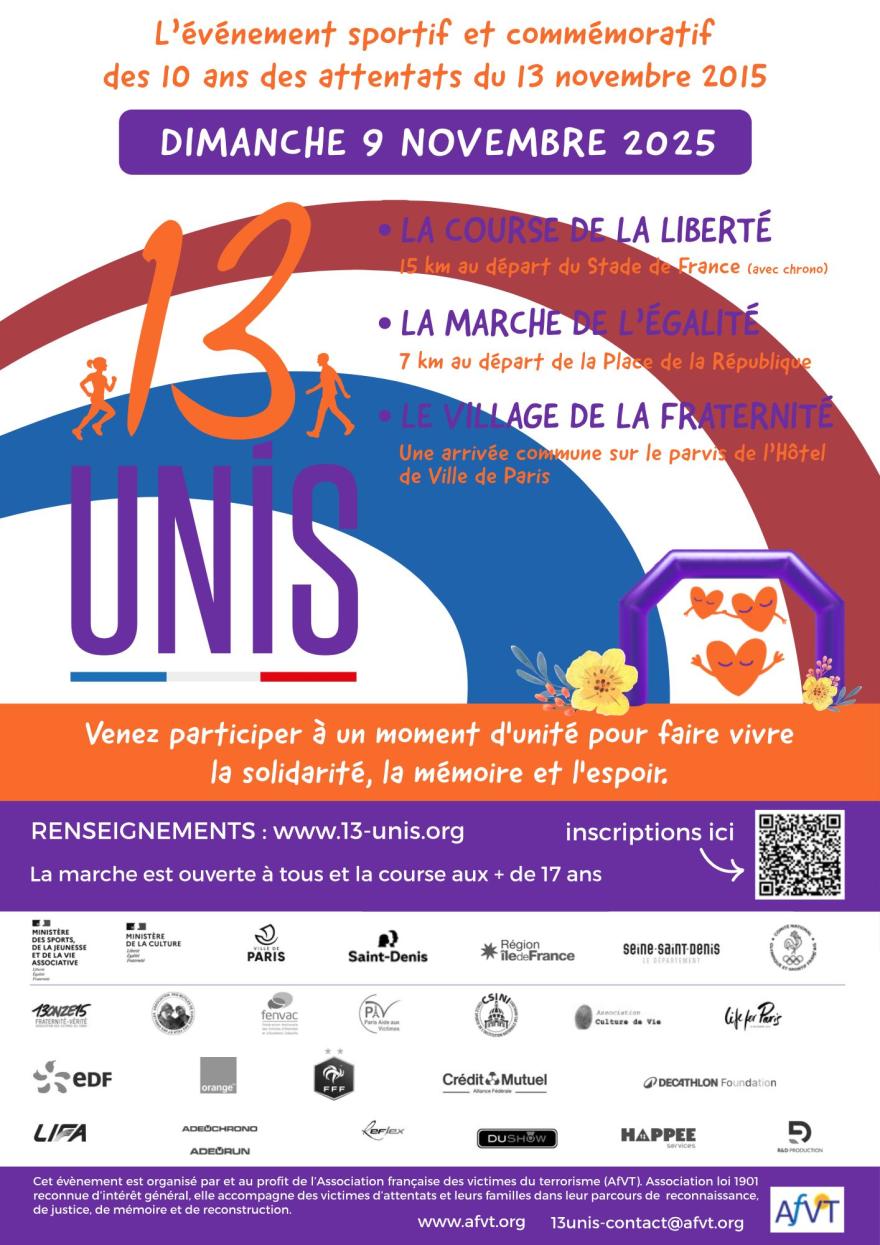 "13 ~ UNIS" est un évènement commémoratif sportif et citoyen pour honorer la mémoire des victimes des attentats du 13 novembre 2015 organisé par l'AFVT